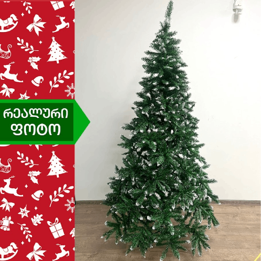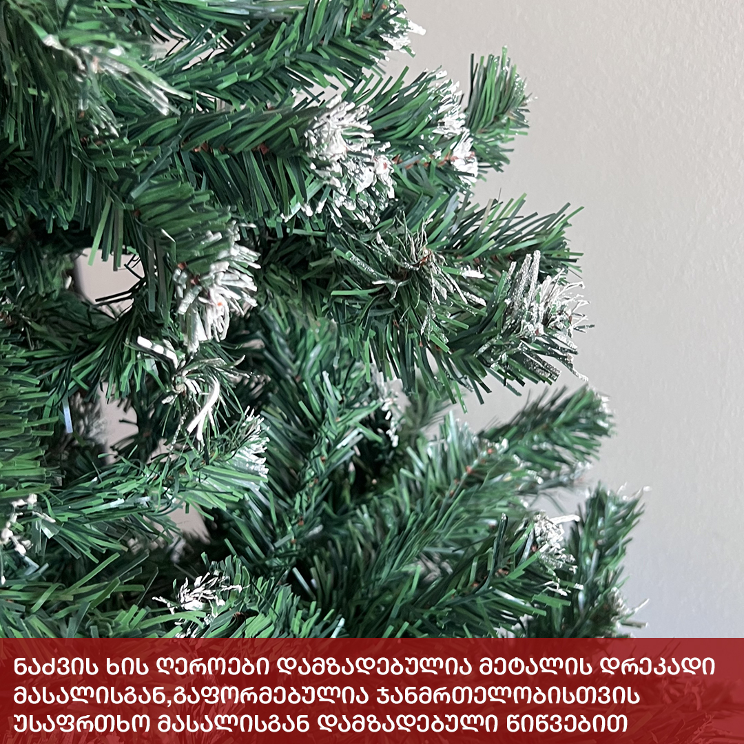 ნაძვის ხე დათოვლილი ბოლოებით,გამძლე დრეკადი მეტალის ტოტებით და ჯანმრთელობისთვის უსაფრთხო მასალისგან დამზადებული წიწვებით. მეტალის მყარი სადგამით და მთავარი ღერძით.