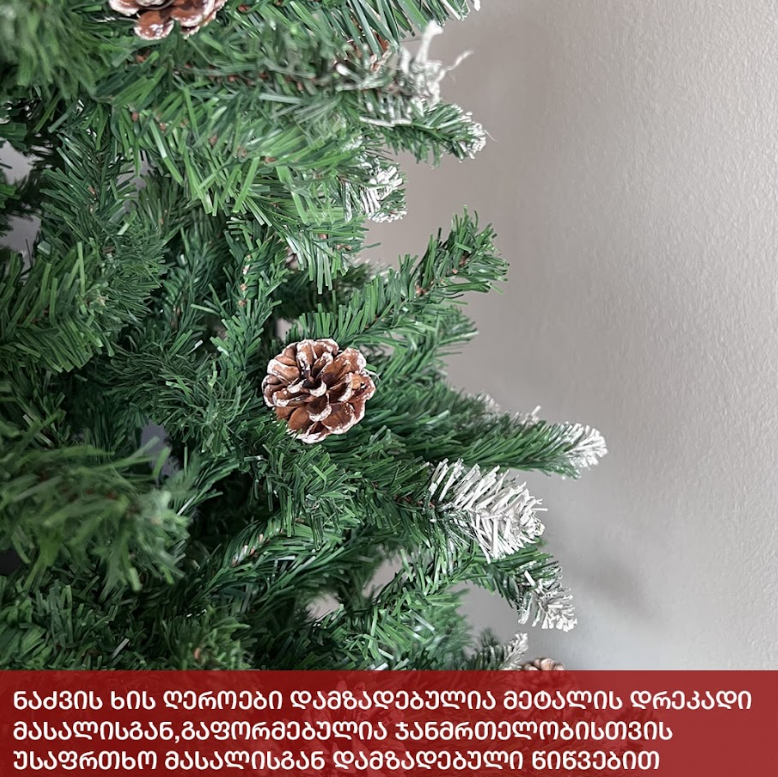ნაძვის ხე დათოვლილი ბოლოებით, გაფორმებული გირჩებით. გამძლე დრეკადი მეტალის ტოტებით და ჯანმრთელობისთვის უსაფრთხო მასალისგან დამზადებული წიწვებით. მეტალის მყარი სადგამით და მთავარი ღერძით.