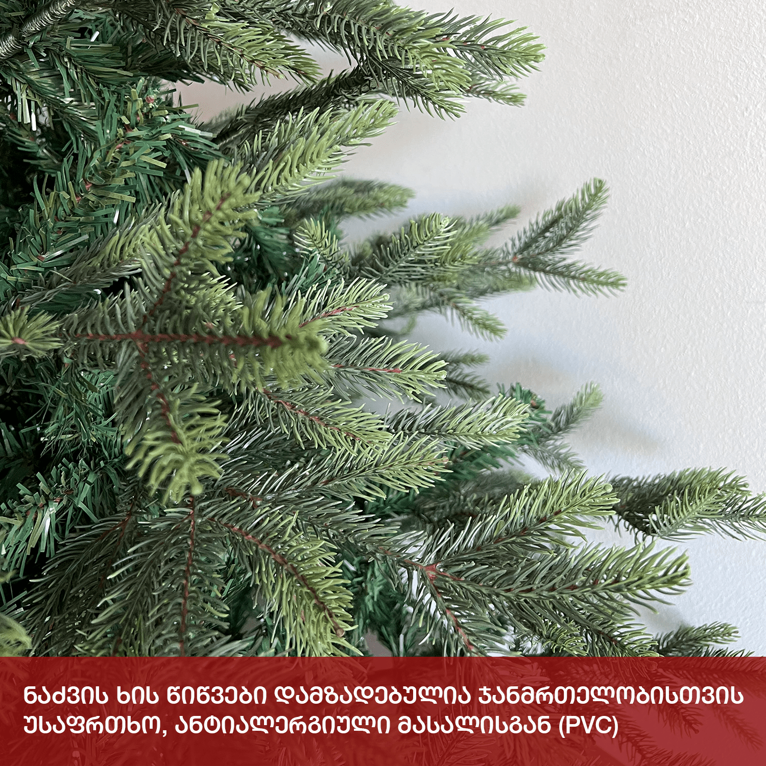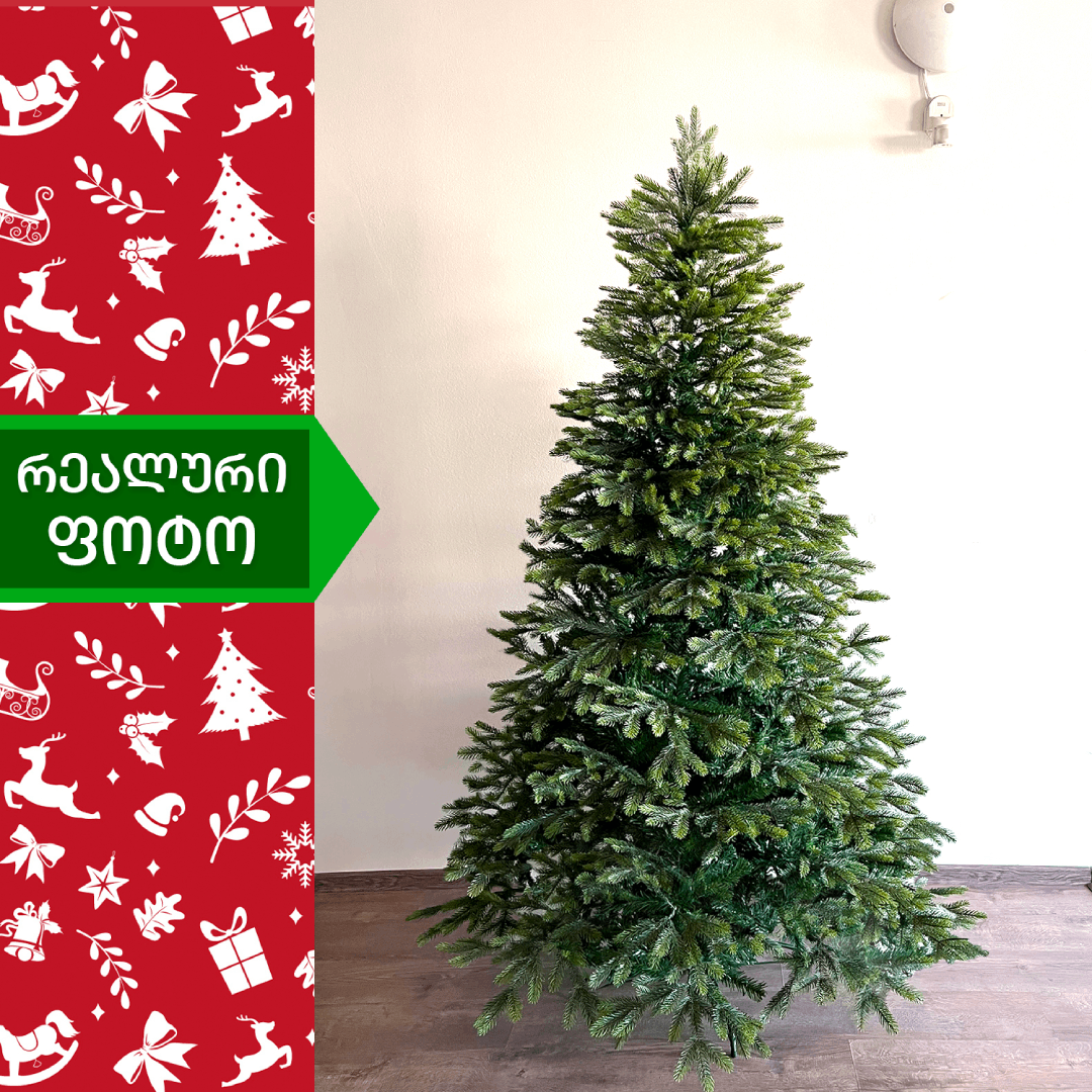 ბუნებრივის მსგავსი ნაძვის ხე, დრეკადი მეტალის ტოტებით და ჯანმრთელობისთვის უსაფრთხო მასალისგან დამზადებული შერეული ორი ფერის, სილიკონის და PVC წიწვით . მეტალის მყარი სადგამით და მთავარი ღერძით.