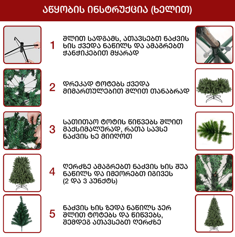 სადა მწვანე ნაძვის ხე გამძლე დრეკადი მეტალის ტოტებით და ჯანმრთელობისთვის უსაფრთხო მასალისგან დამზადებული წიწვებით. მეტალის მყარი სადგამით და მთავარი ღერძით.