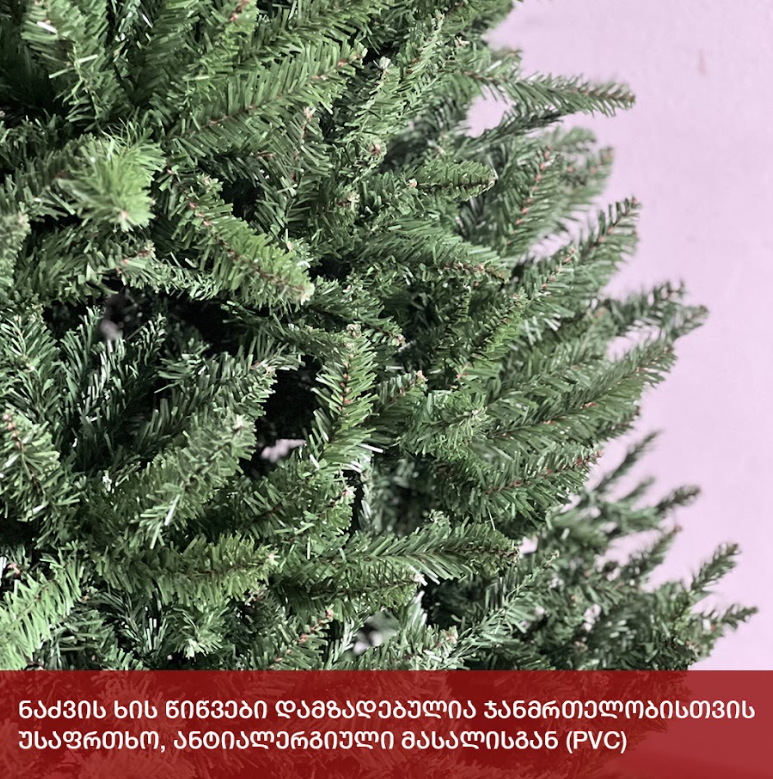 პრემიუმ ხარისხის, დაბურული მწვანე სადა ნაძვის ხე გამძლე დრეკადი მეტალის ტოტებით და ჯანმრთელობისთვის უსაფრთხო მასალისგან დამზადებული წიწვებით. მეტალის მყარი სადგამით და მთავარი ღერძით.