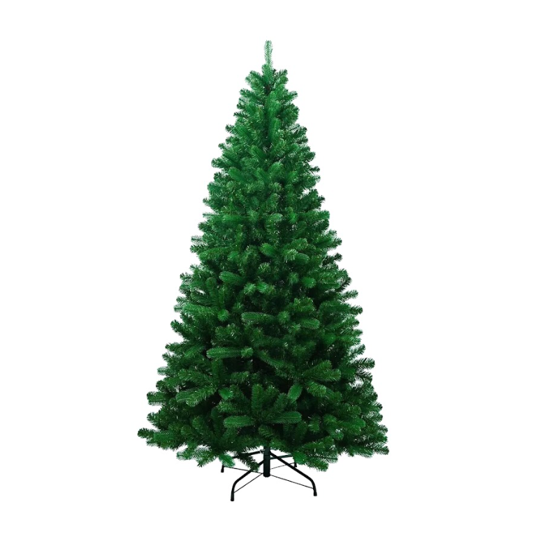 სადა მწვანე ნაძვის ხე გამძლე დრეკადი მეტალის ტოტებით და ჯანმრთელობისთვის უსაფრთხო მასალისგან დამზადებული წიწვებით. მეტალის მყარი სადგამით და მთავარი ღერძით.