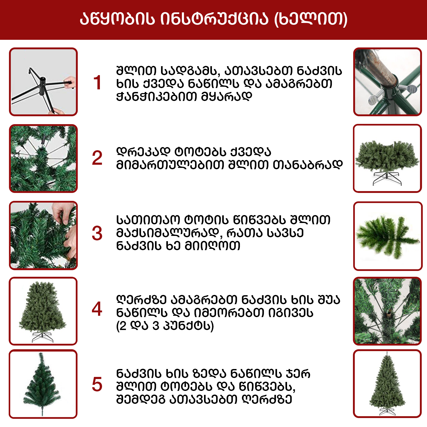 ნაძვის ხე დათოვლილი ბოლოებით,გამძლე დრეკადი მეტალის ტოტებით და ჯანმრთელობისთვის უსაფრთხო მასალისგან დამზადებული წიწვებით. მეტალის მყარი სადგამით და მთავარი ღერძით.