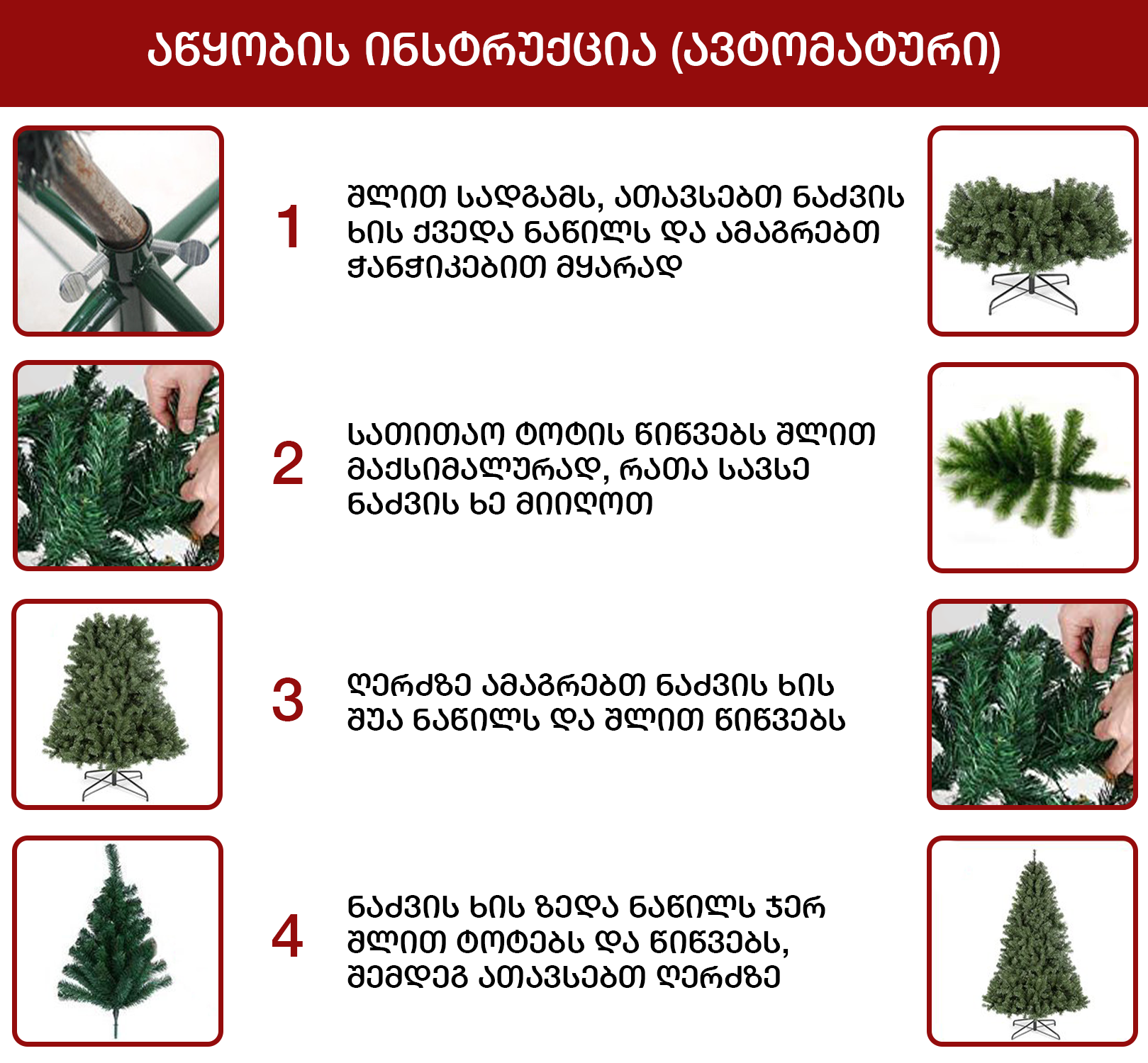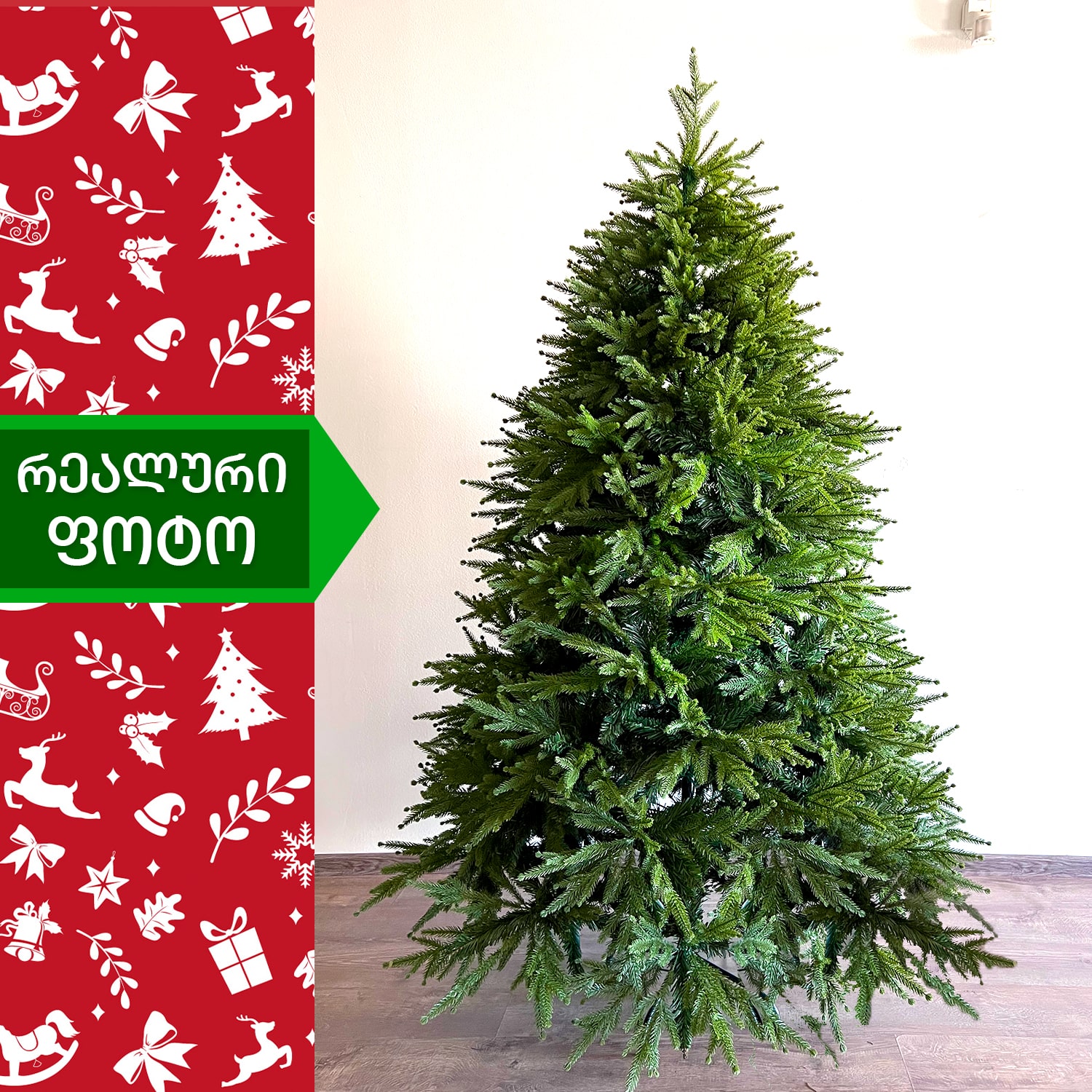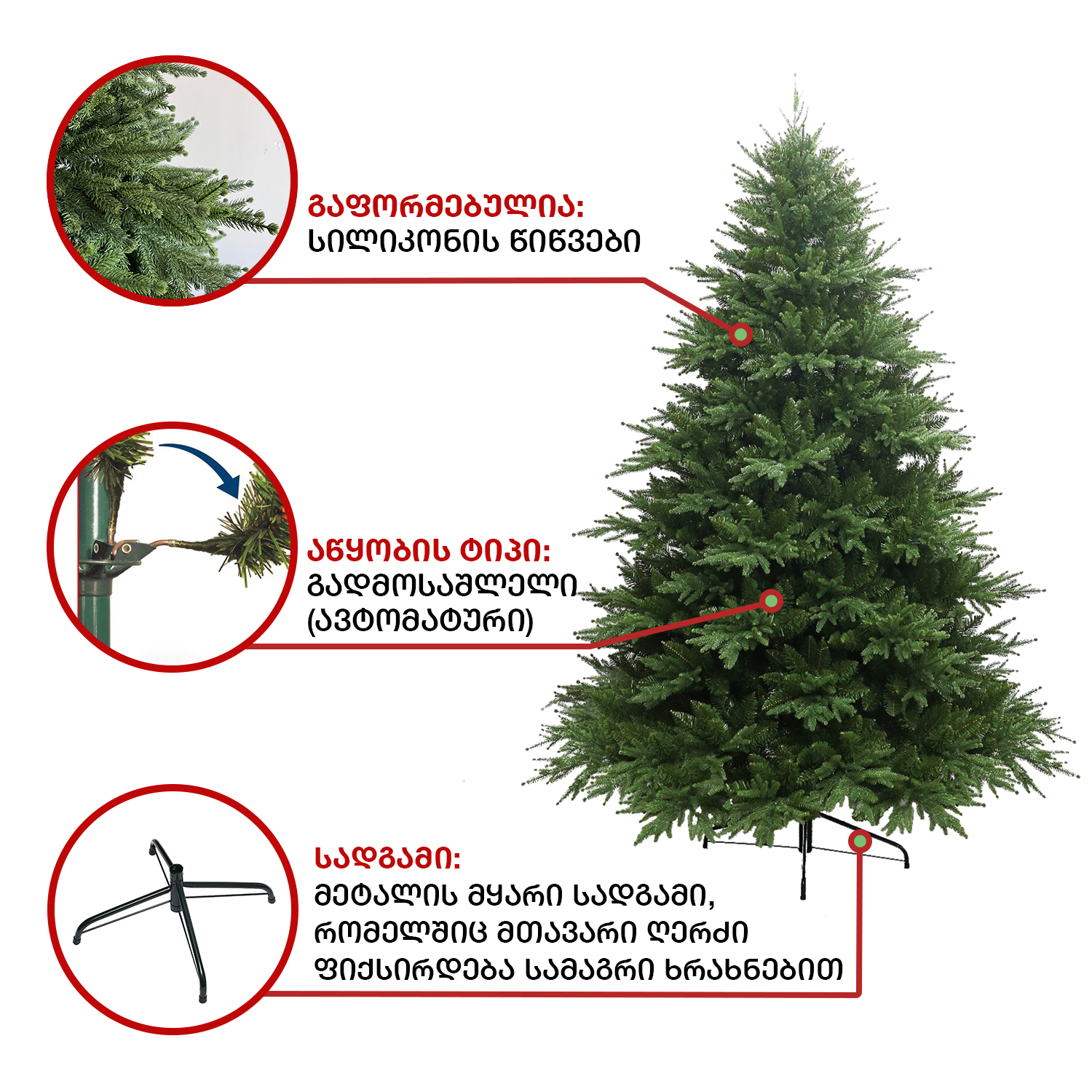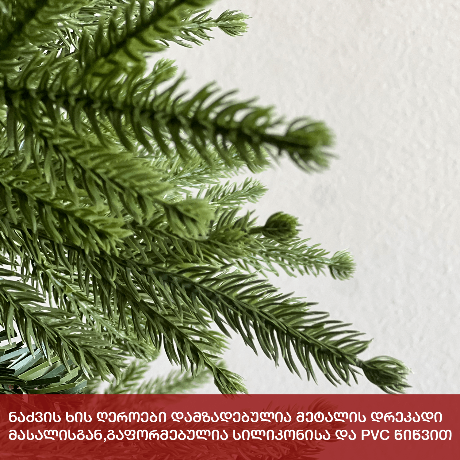 ბუნებრივის მსგავსი ნაძვის ხე, დრეკადი მეტალის ტოტებით და ჯანმრთელობისთვის უსაფრთხო მასალისგან დამზადებული შერეული ორი ფერის, სილიკონის და PVC წიწვით . მეტალის მყარი სადგამით და მთავარი ღერძით.