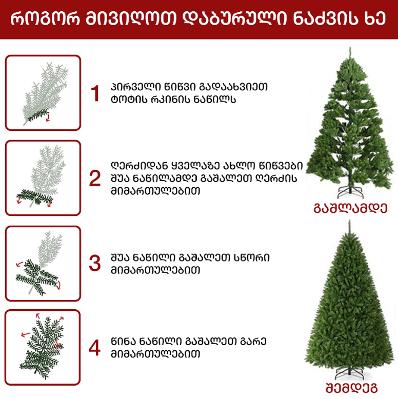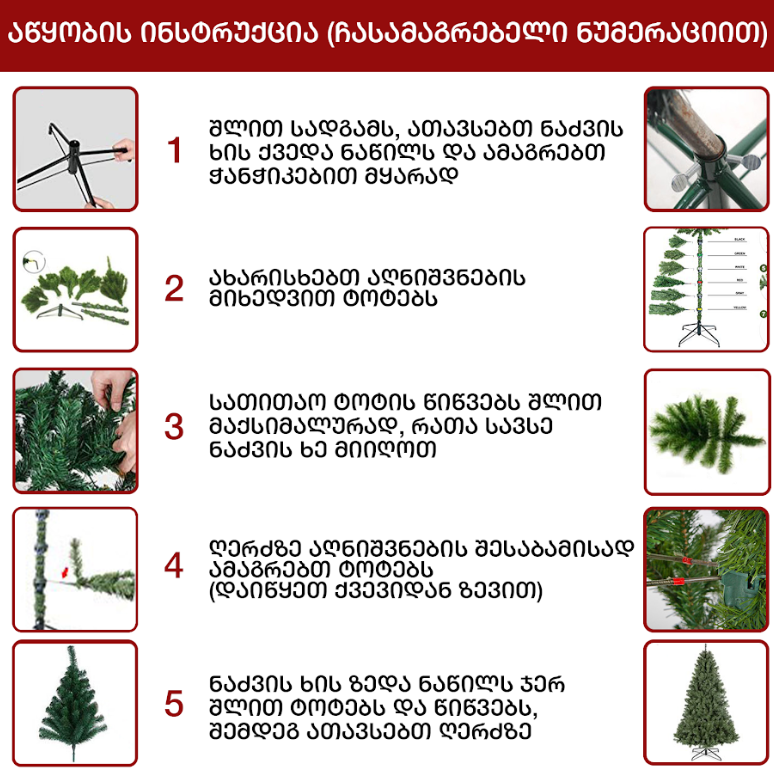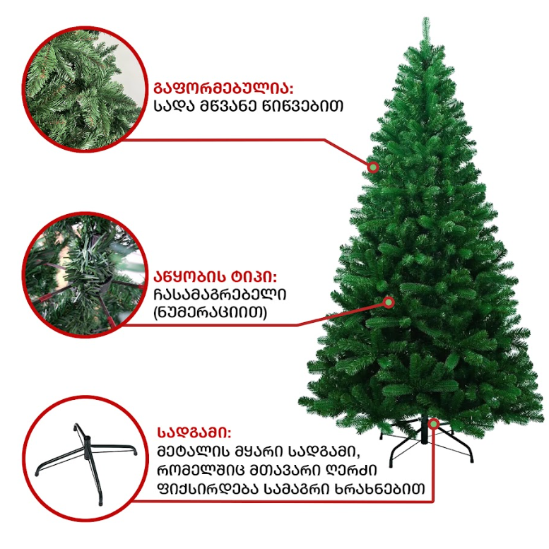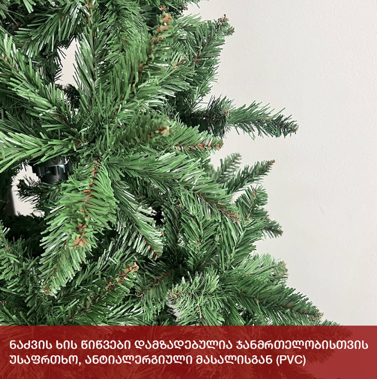 სადა მწვანე ნაძვის ხე გამძლე დრეკადი მეტალის ტოტებით და ჯანმრთელობისთვის უსაფრთხო მასალისგან დამზადებული წიწვებით. მეტალის მყარი სადგამით და მთავარი ღერძით.