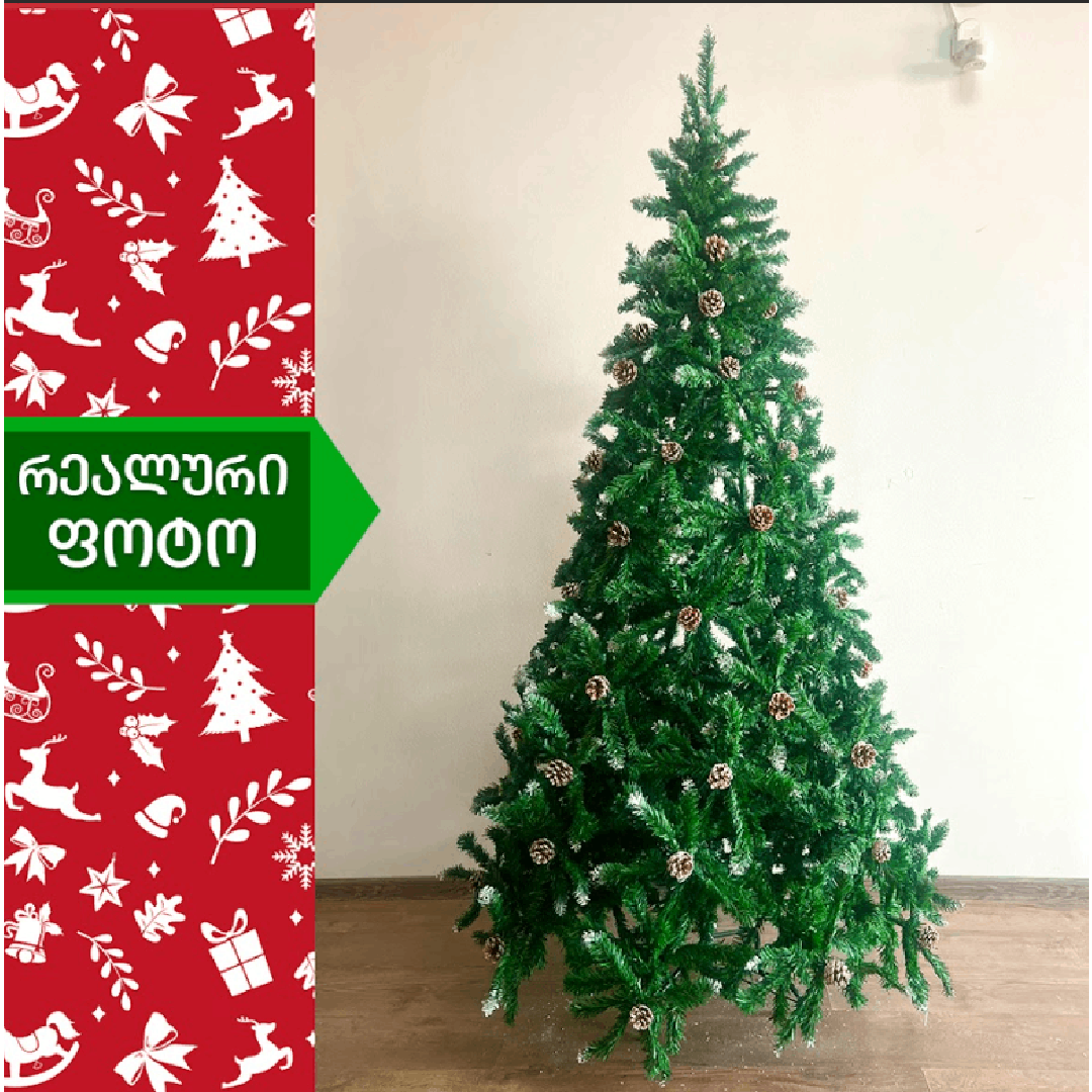 ნაძვის ხე დათოვლილი ბოლოებით, გაფორმებული გირჩებით. გამძლე დრეკადი მეტალის ტოტებით და ჯანმრთელობისთვის უსაფრთხო მასალისგან დამზადებული წიწვებით. მეტალის მყარი სადგამით და მთავარი ღერძით.