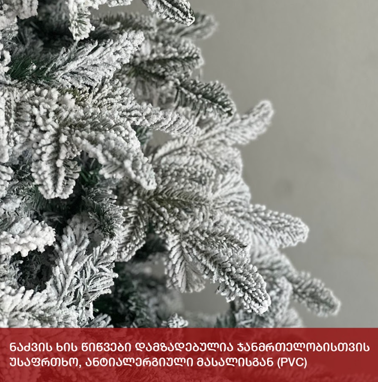 დათოვლილი ბუნებრივის მსგავსი ნაძვის ხე,გამძლე დრეკადი მეტალის ტოტებით და ჯანმრთელობისთვის უსაფრთხო მასალისგან დამზადებული სილიკონის და PVC წიწვებით. მეტალის მყარი სადგამით და მთავარი ღერძით.