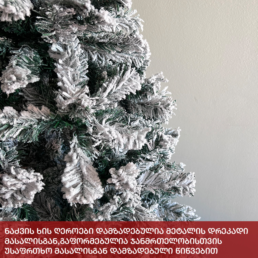 დათოვლილი ნაძვის ხე გამძლე დრეკადი მეტალის ტოტებით და ჯანმრთელობისთვის უსაფრთხო მასალისგან დამზადებული წიწვებით. მეტალის მყარი სადგამით და მთავარი ღერძით.