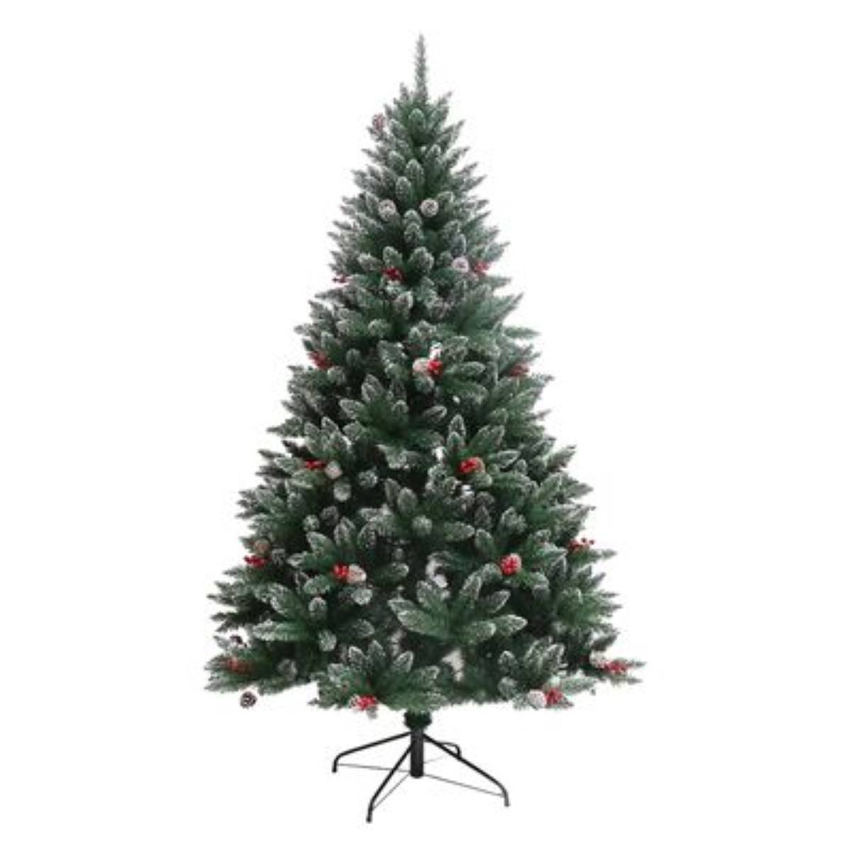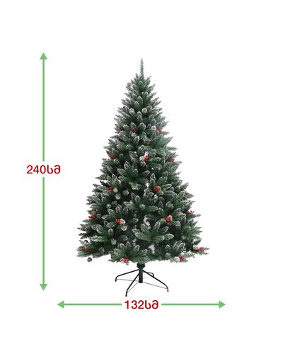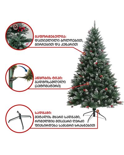 - ნაძვის ხე დათოვლილი ბოლოებით, გაფორმებული გირჩებით და კენკრით.