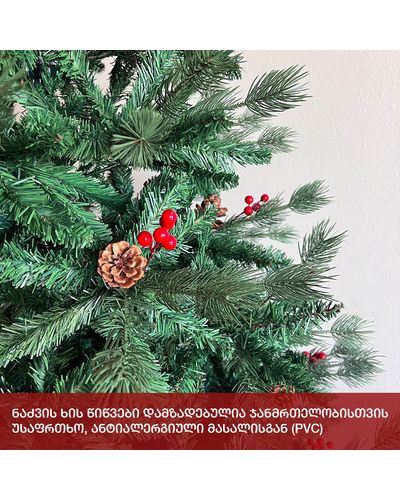- გამძლე დრეკადი მეტალის ტოტებით და ჯანმრთელობისთვის უსაფრთხო მასალისგან დამზადებული წიწვებით;