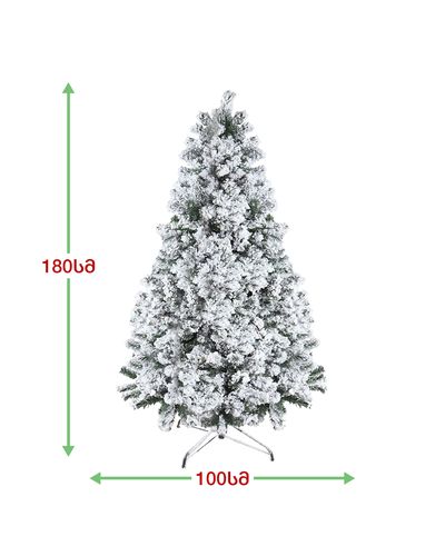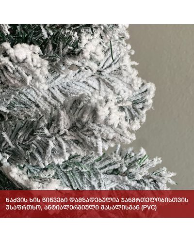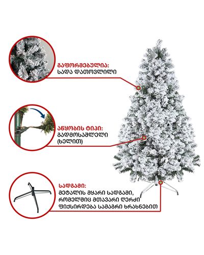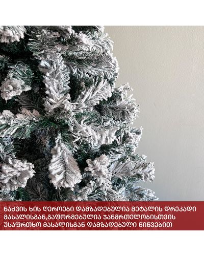 - დათოვლილი ნაძვის ხე გამძლე დრეკადი მეტალის ტოტებით და ჯანმრთელობისთვის უსაფრთხო მასალისგან დამზადებული წიწვებით;