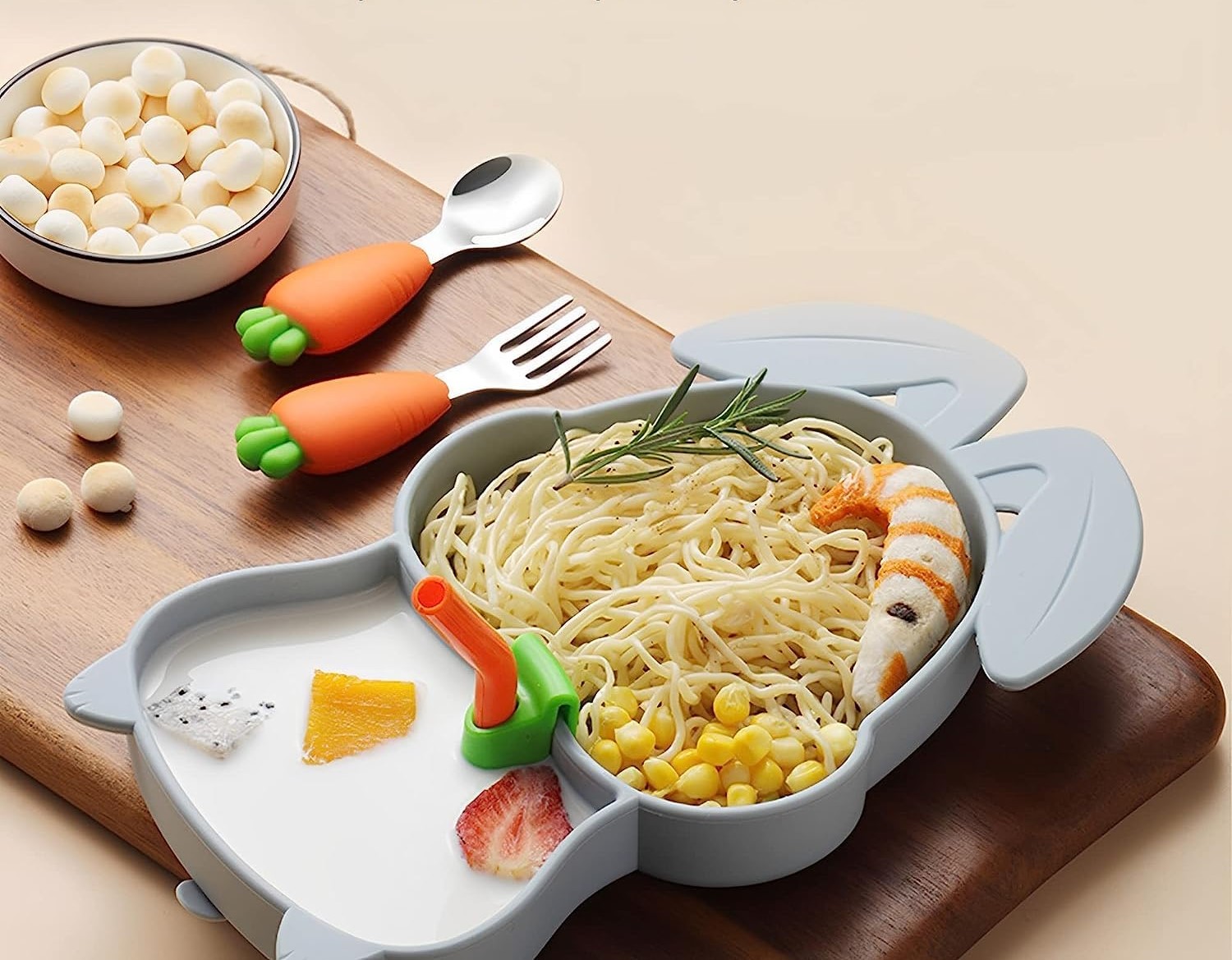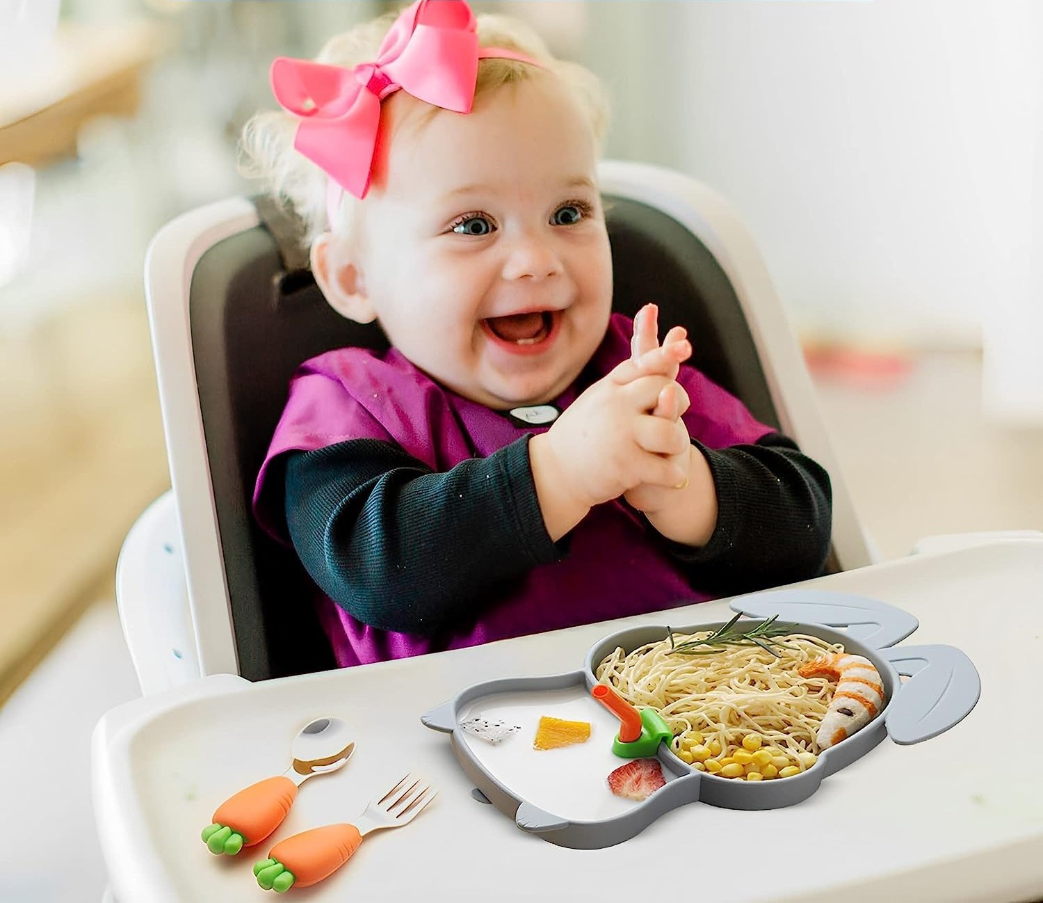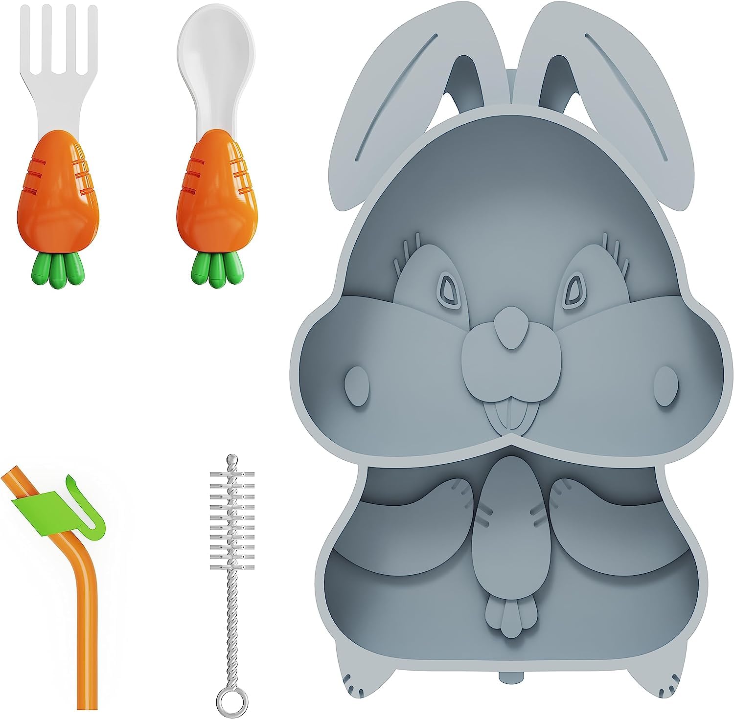 კომპლექტაციაში შედის: სილიკონის თეფში, კოვზი, ჩანგალი, საწრუპი, საწრუპის გასარეცხი ჩოთქი.