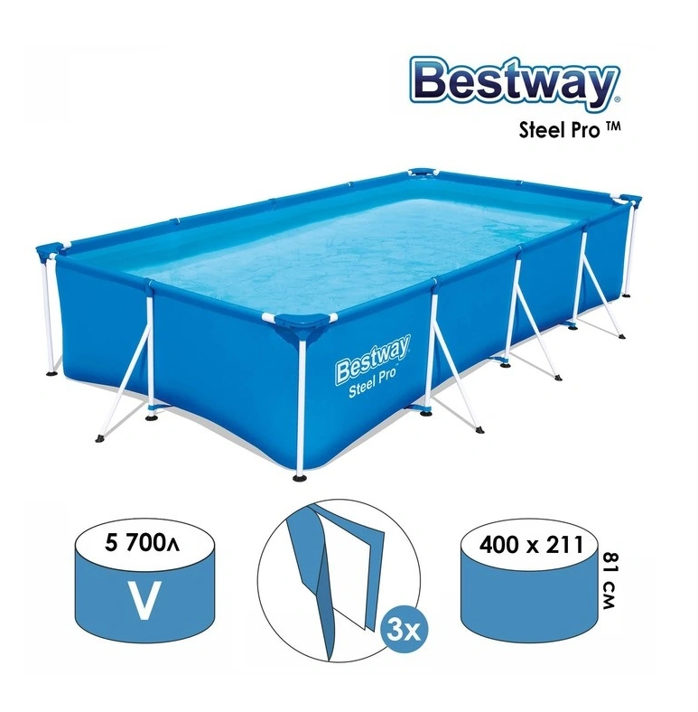 Bestway 56405 – პრაქტიკული და კომპაქტური გადაწყვეტილება თქვენი ეზოსთვის. მართკუთხა ფორმა სივრცის მაქსიმალურად ეფექტურად ათვისების საშუალებას იძლევა, ხოლო 81 სმ სიმაღლე იდეალურია საოჯახო გართობისა და ბავშვების უსაფრთხო ცურვისთვის. Steel Pro™ ტექნოლოგია უზრუნველყოფს სიმყარესა და ხანგრძლივ ექსპლუატაციას.
