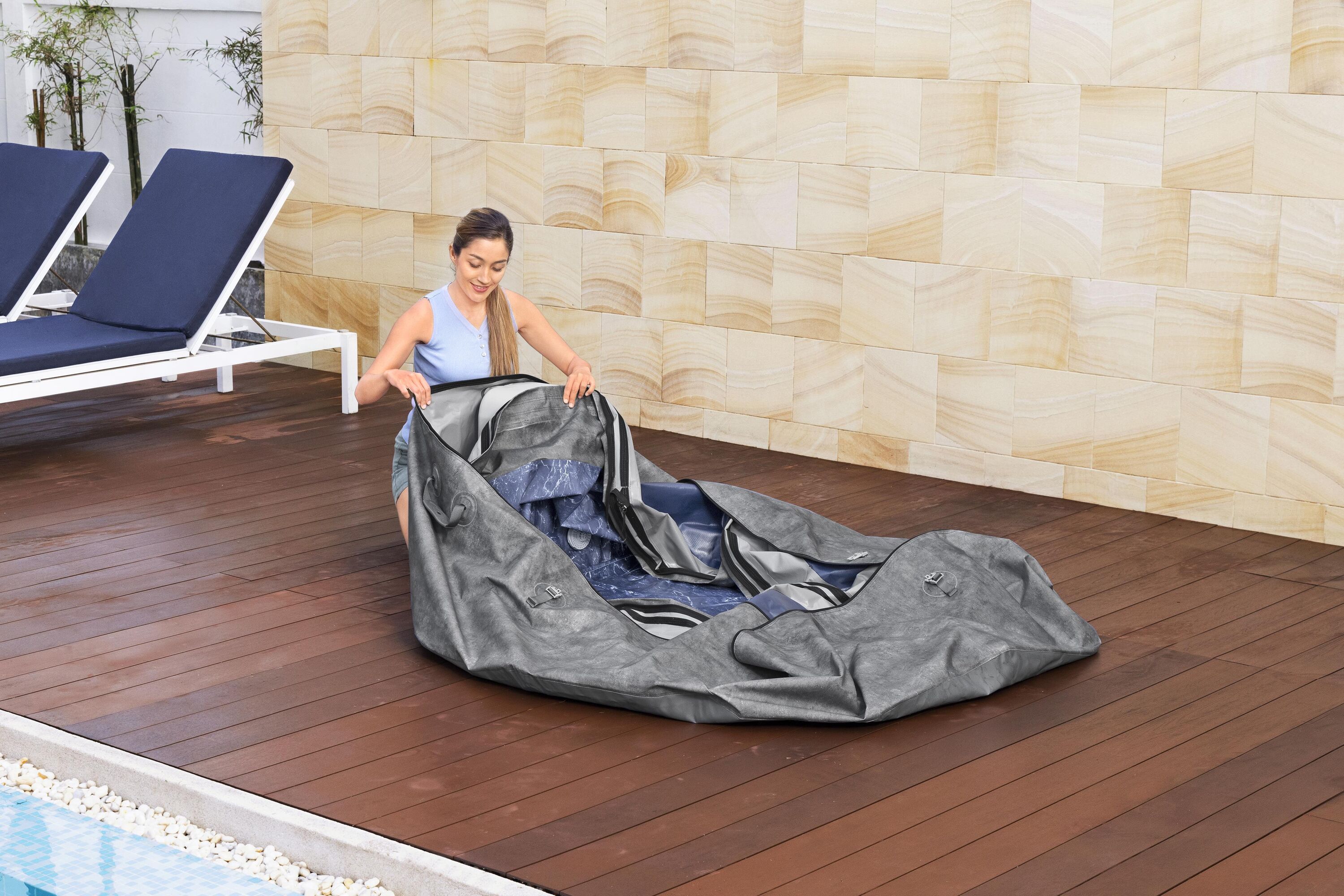 ჯაკუზს მოყვება გამაგრებული დამცავი საფარი სპეციალური საკეტებით (Lock Clips), რაც უზრუნველყოფს: