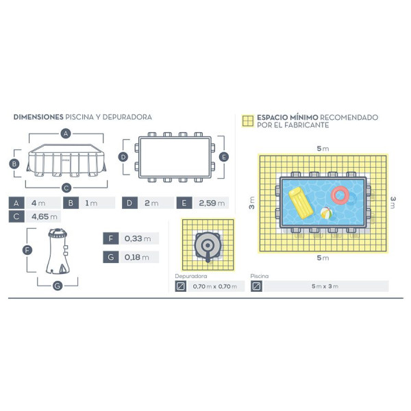 ბრენდი: Intex; მოდელი: 26788; ფერი: ნაცრისფერი; ტიპი: კარკასული; ფორმა: მართკუთხედი; ფილტრი: კი; სიგრძე: 400 სმ; სიგანე: 200 სმ; სიმაღლე: 100 სმ; ტევადობა: 6836 ლ; ფილტრის ტიპი: კარტრიჯული; კიბე: კი; სხვა: ინსტრუქცია