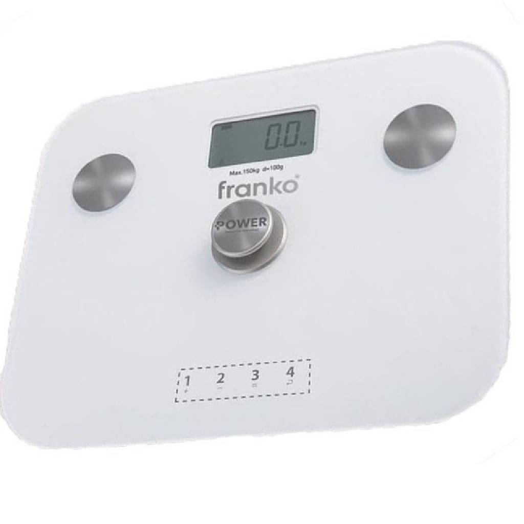 ბრენდი: Franko; მოდელი: FBS-1172; ფერი: თეთრი; ქვეყანა: ჩინეთი; გარანტია: 12 თვე; ტიპი: ელემენტის გარეშე; მინიმალური წონა: 8; მაქსიმალური წონა: 150; დამატებითი ფუნქციები: ადვილად წმენდადი ზედაპირი, ავტომატური გათიშვა/განულება, მეხსიერება: 4 ადამიანი, ძვლის, ცხიმის, წყლის და კუნთის მასის ინდექსის გამოთვლა