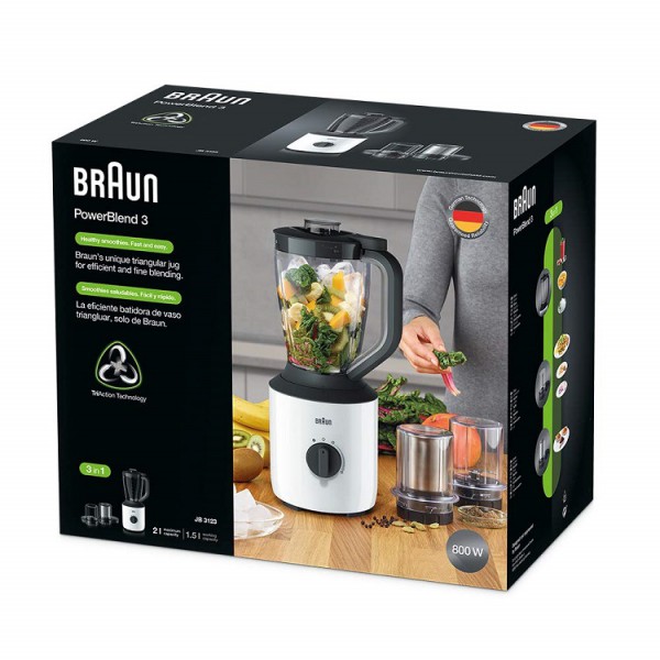 ბრენდი: Braun; მოდელი: JB3150WH; ფერი: თეთრი; გარანტია: 24 თვე; ტიპი: სტაციონალური; სიმძლავრე: 800 W; ბლენდერის ჭიქის მოცულობა: 1.5 ლ; ძირთადი ფუნქცია: ბლენდერი; ფუნქციები: დაბლენდერება, დაჭრა, ჩუმი მუშაობა; კორპუსის მასალა: პლასტმასი; დანების მასალა: უჟანგავი ფოლადი; კომპლექტაცია: ბლენდერის ჭიქა; ზომა: 40,6 x 20,0 სმ; წონა: 3.4 კგ; კვების ტიპი: ქსელის