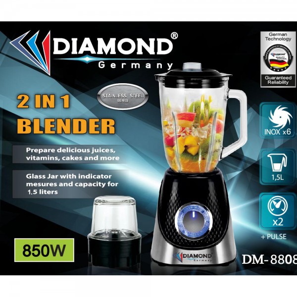ბრენდი: Diamond; მოდელი: DM-8808; ფერი: შავი; გარანტია: 12 თვე; ტიპი: სტაციონალური; სიმძლავრე: 850 W; სიჩქარეთა რაოდენობა: 2; ბლენდერის ჭიქის მოცულობა: 1.5 ლ; ძირთადი ფუნქცია: ბლენდერი, ყავის საფქვავი; ფუნქციები: ათქვეფა, დაბლენდერება, იმპულსური რეჟიმი, ყავის დაფქვა; ჯამის მასალა: პლასტმასი; დანების მასალა: უჟანგავი ფოლადი; კომპლექტაცია: ბლენდერის საცმი, ბლენდერის ჭიქა, თავსახური, ყავის საფქვავი; კვების ტიპი: ქსელის