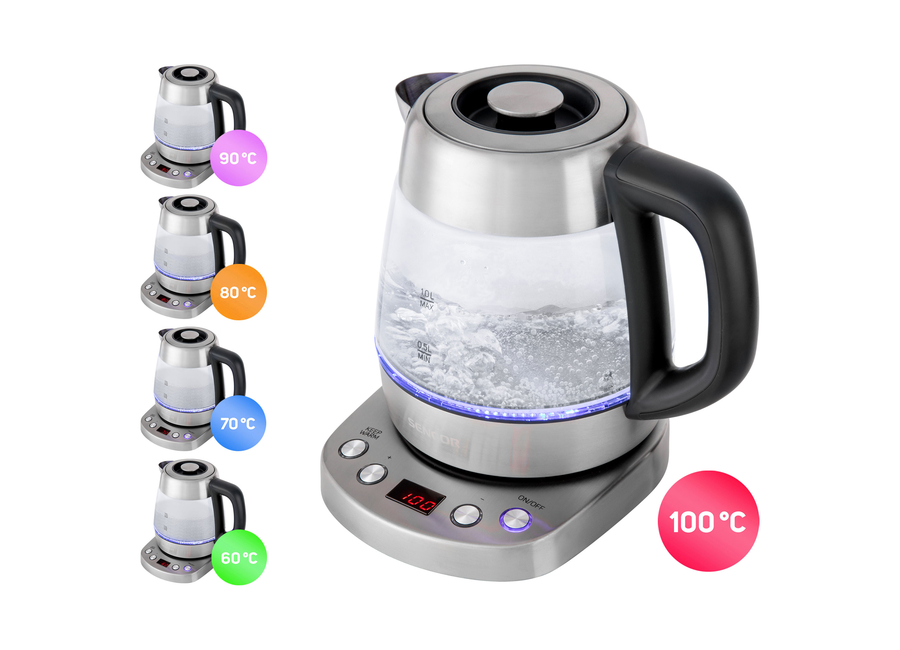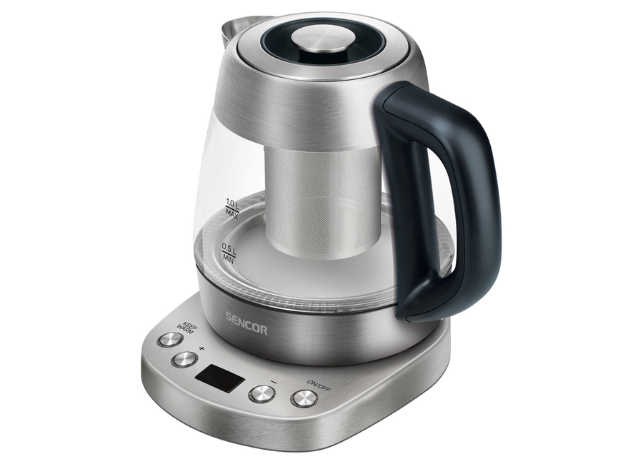 ბრენდი: Sencor; მოდელი: SWK 1080SS; ფერი: გამჭვირვალე; გარანტია: 24 თვე; ტიპი: ჩაის დასაყენებლით; მართვის ტიპი: ელექტრონული; კორპუსის მასალა: უჟანგავი ფოლადი/მინა; მოცულობა: 1 ლ; სიმძლავრე: 2200 W; ტემპერატურის რეგულირების რეჟიმები: 100°C, 60°C, 70℃, 80℃, 90℃; გამაცხელებელი ელემენტი: დახურული; სხვა ფუნქციები: ავტომატური გათიშვა, გადახურებისგან დაცვა, დისპლეი, მოხსნადი (რეცხვადი) ფილტრი, სადგამის ბრუნვა 360 გრადუსით, ტემპერატურის შენარჩუნება, ჩართვა/გამორთვის ხმოვანი ინდიკაცია, წყლის დონის ინდიკატორი; წონა: 0.88 კგ; კვების ტიპი: ქსელის
