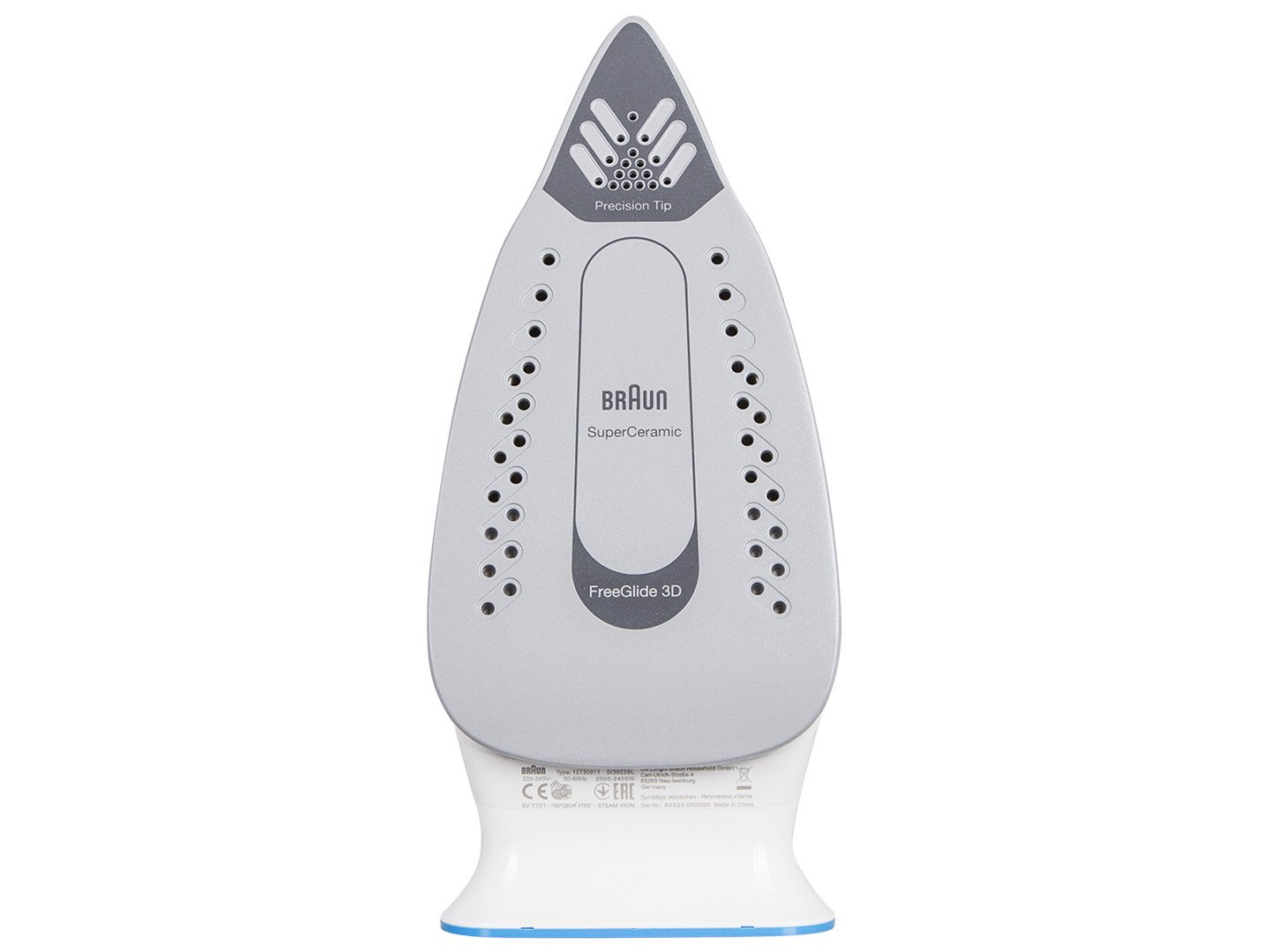 ბრენდი: Braun; მოდელი: SI3053BL; ფერი: ლურჯი; ტიპი: ორთქლის; სიმძლავრე: 2400 W; ორთქლის მიწოდება: 45 გრ/წთ; ორთქლის დარტყმის ძალა: 170 გრ/წთ; ლანჩი მასალა: კერამიკა; ფუნქციები: ავტომატური გათიშვა, ვერტიკალური დაორთქვლა, თერმოსტატი, თვითწმენდის ფუნქცია, ორთქლის აქტიური ზონების რაოდენობა: 3, წვეთსაწინააღმდეგო სისტემა, წყლის შესხურება; კვება: ქსელი; სადენის სიგრძე: 2 მ